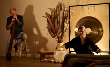 You'll then be surrounded by the deep, resonant sounds and vibrations of three magnificent large gongs and the earthy, grounding sound of the didgeridoo.
